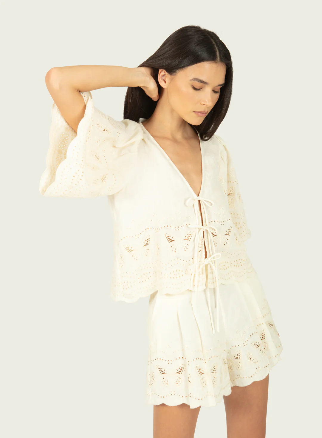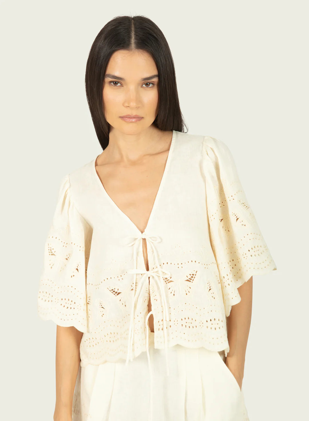 Made from cotton linen, the 'Floria' top has delicate ties at the front that are designed to be loosely knotted and intricate butterfly embroidery on the sleeve and bottom hem.