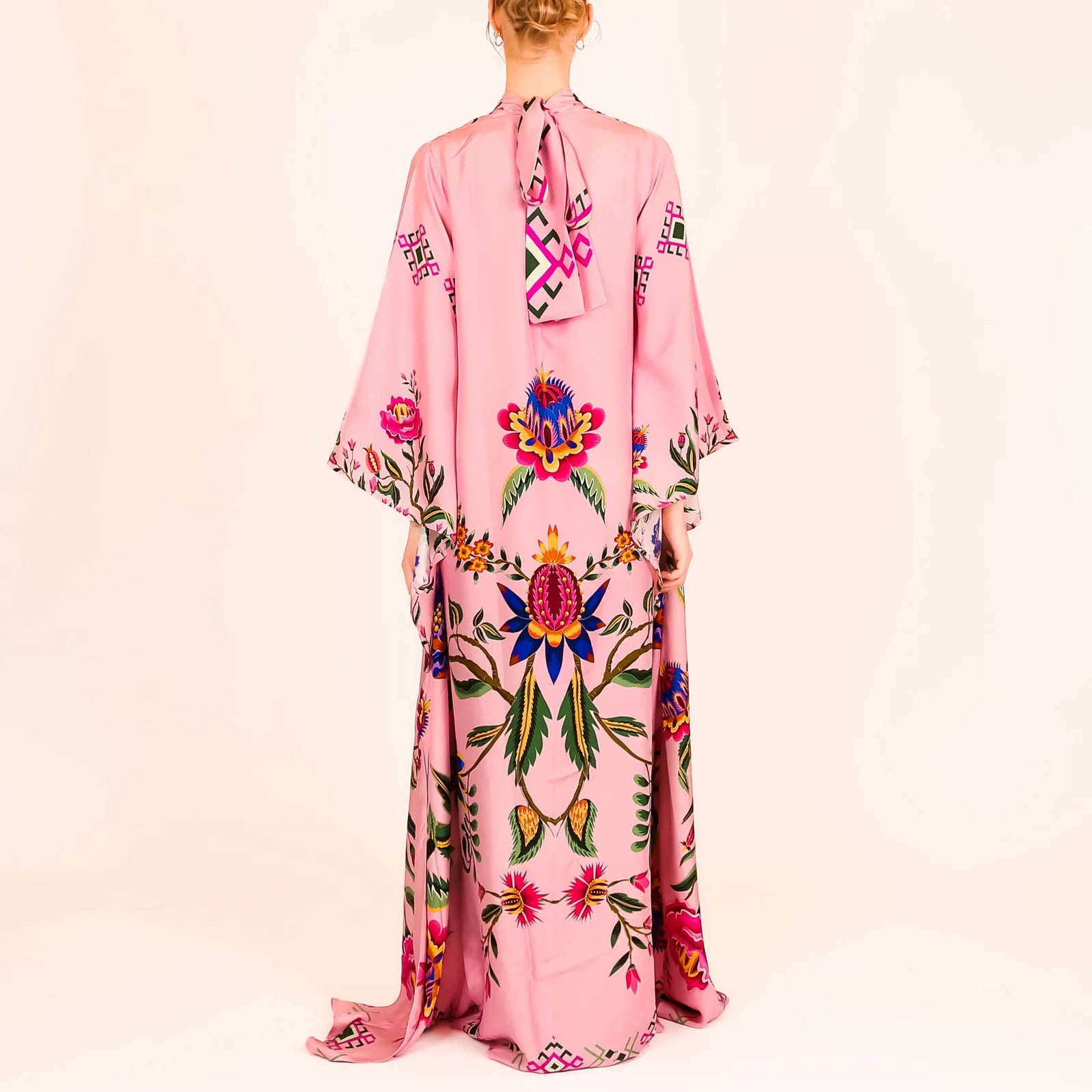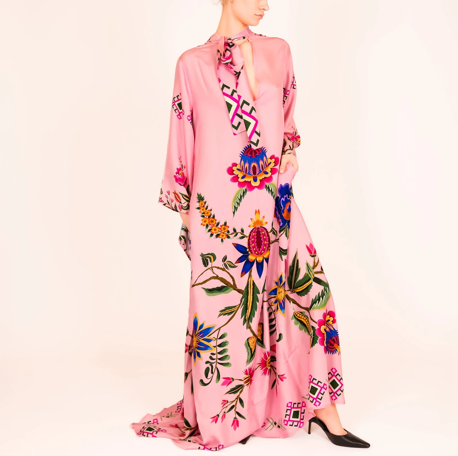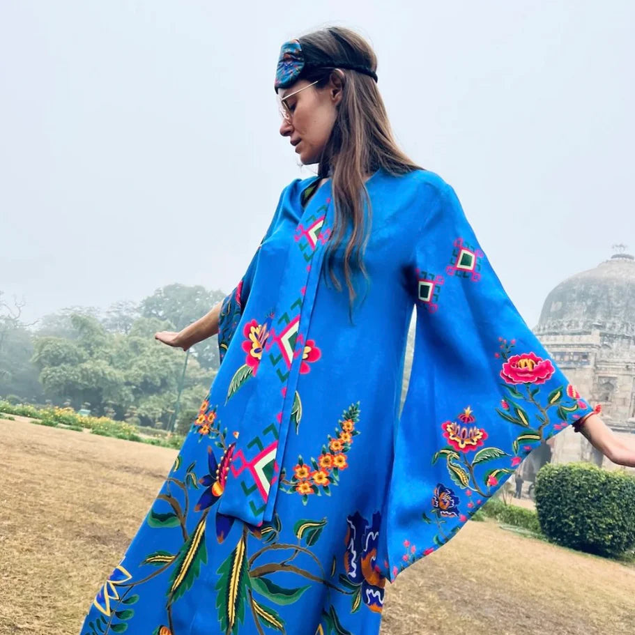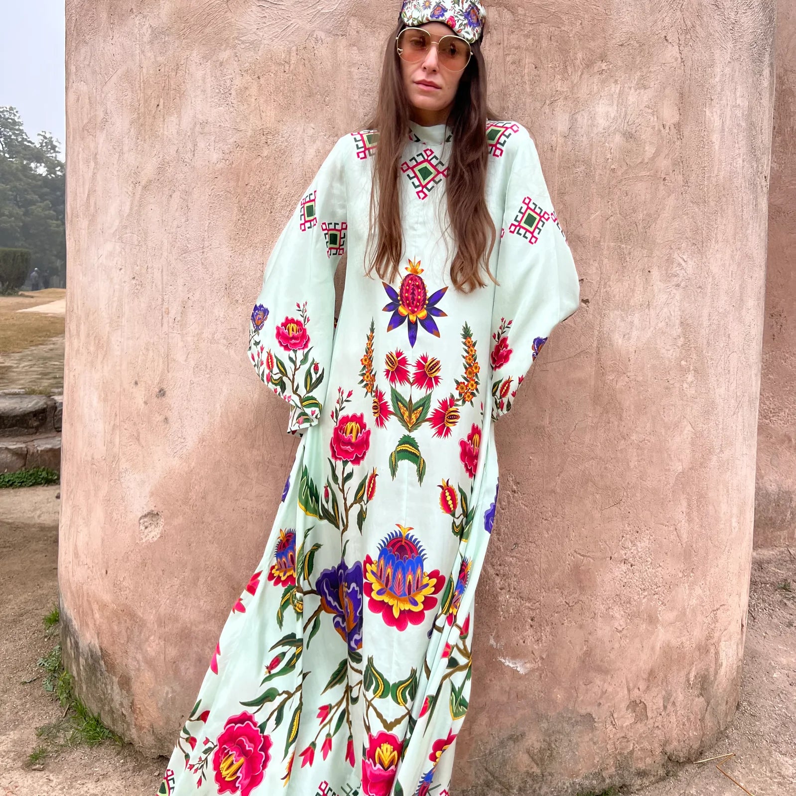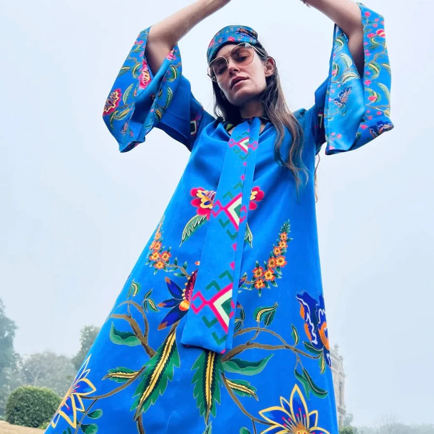 The "Ethno Floral Princess Dress" features an enchanting ethno-floral pattern, vibrant colors, and intricate details for a radiant and elegant look. The flowing silhouette accentuates your curves with grace and lightness, while the pure silk fabric adds a luxurious touch. Crafted with meticulous attention to detail, this Simone Bruns dress exudes exquisite craftsmanship and sophistication, making it a timeless classic.