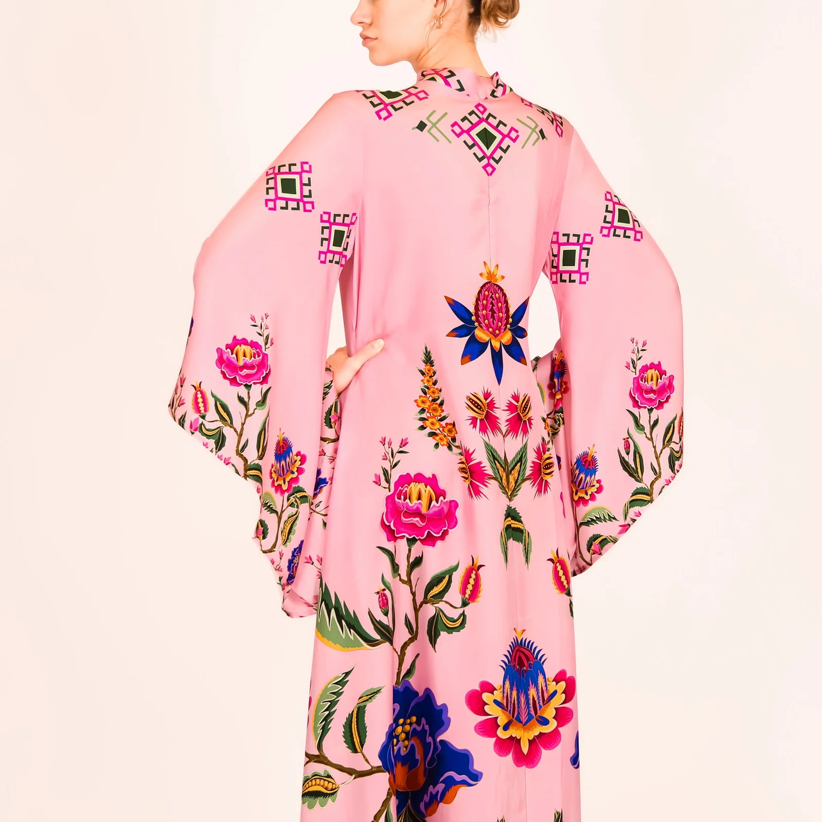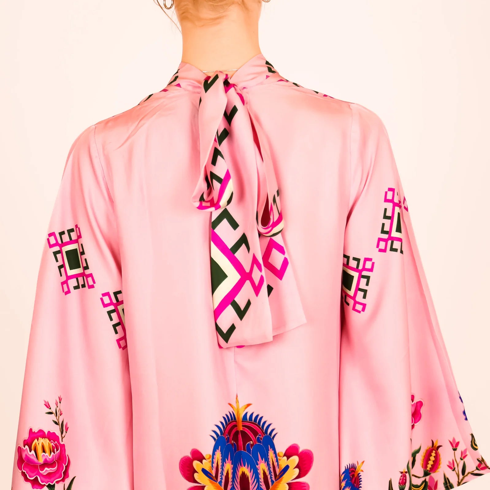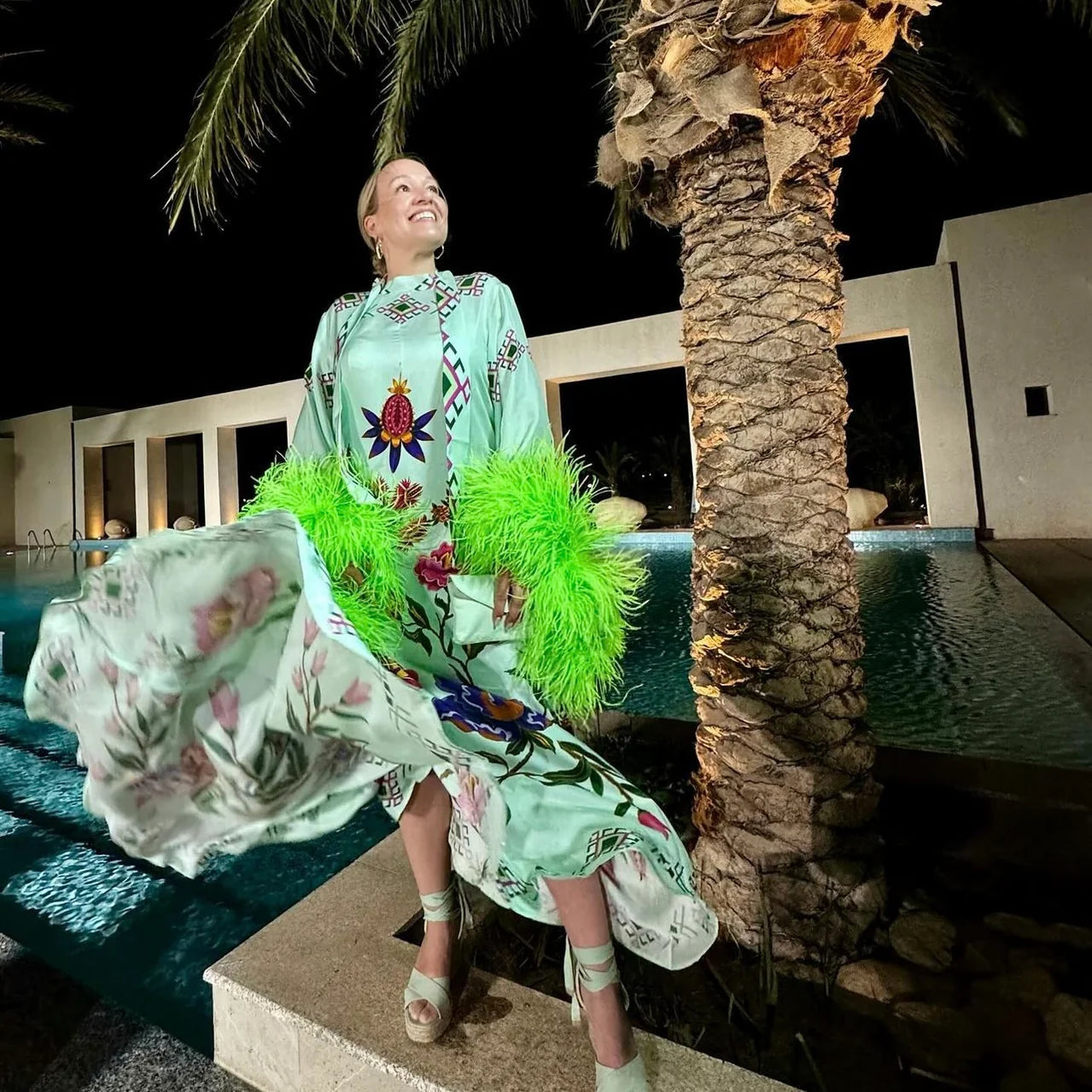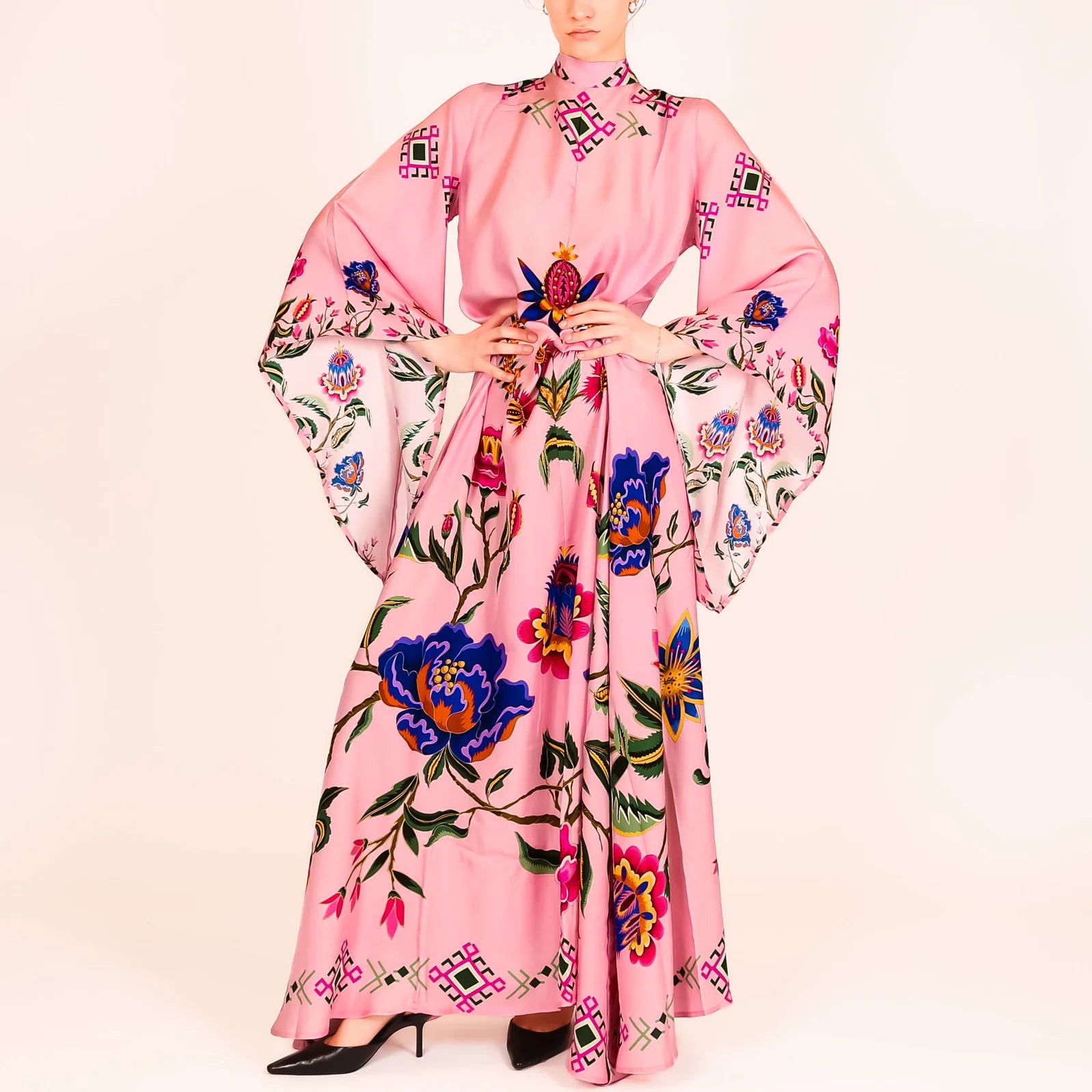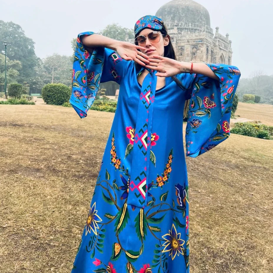 The "Ethno Floral Princess Dress" features an enchanting ethno-floral pattern, vibrant colors, and intricate details for a radiant and elegant look. The flowing silhouette accentuates your curves with grace and lightness, while the pure silk fabric adds a luxurious touch. Crafted with meticulous attention to detail, this Simone Bruns dress exudes exquisite craftsmanship and sophistication, making it a timeless classic.