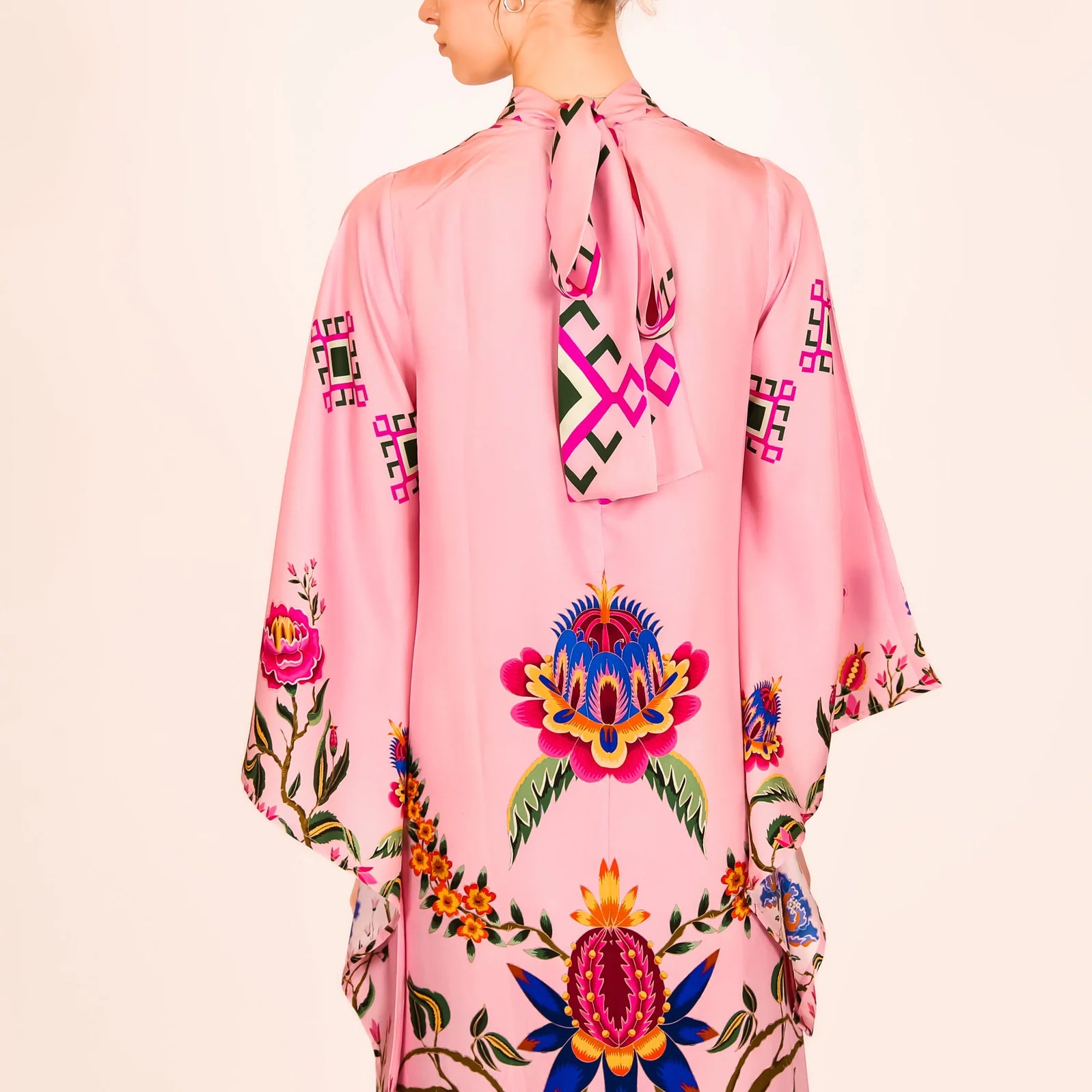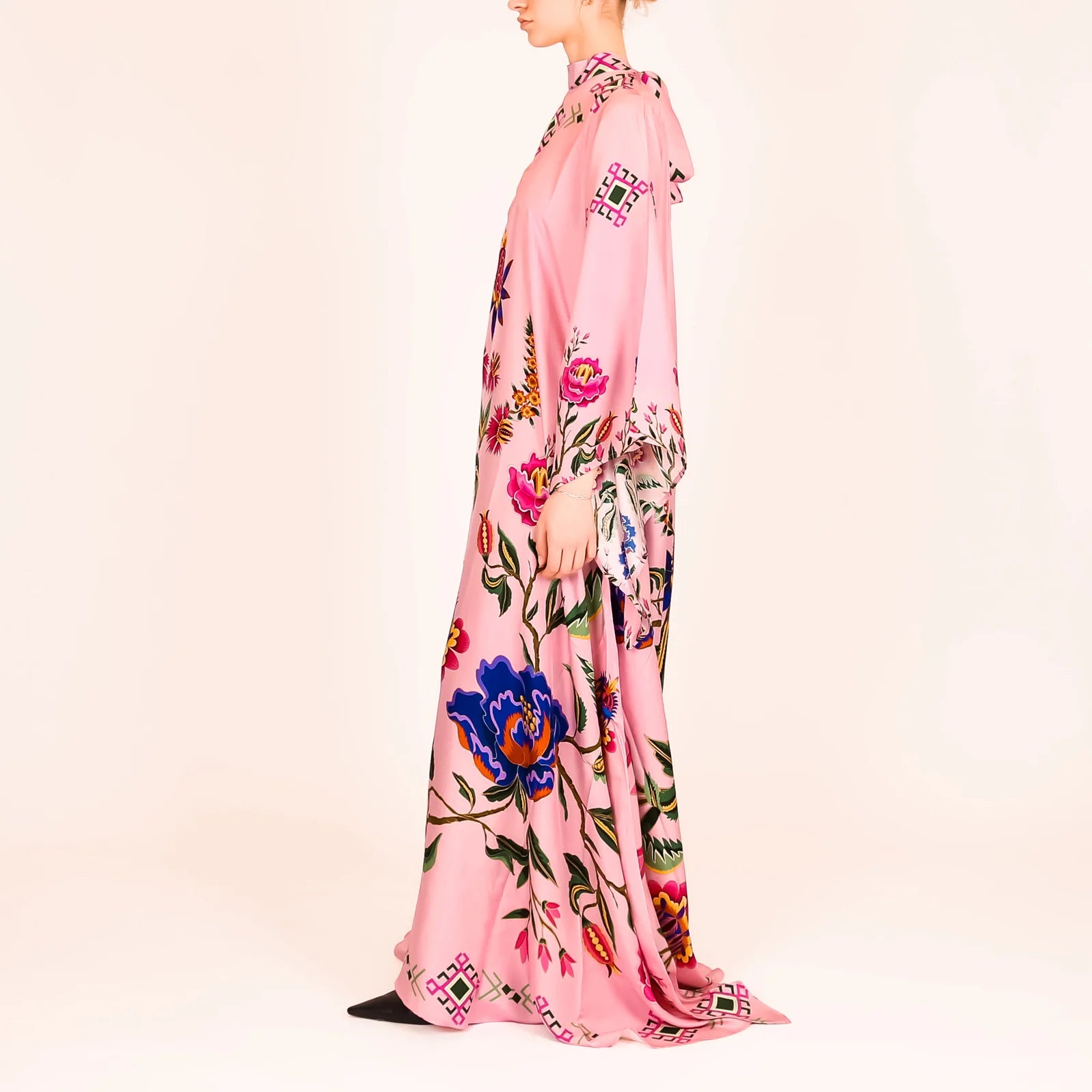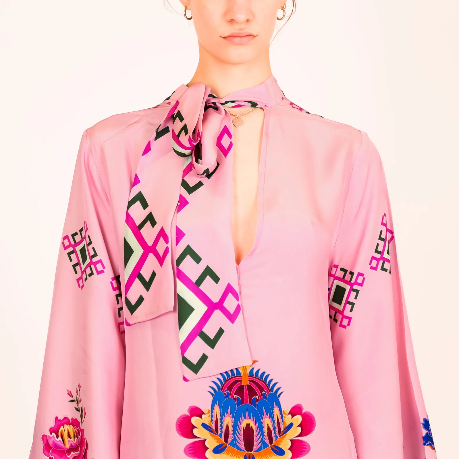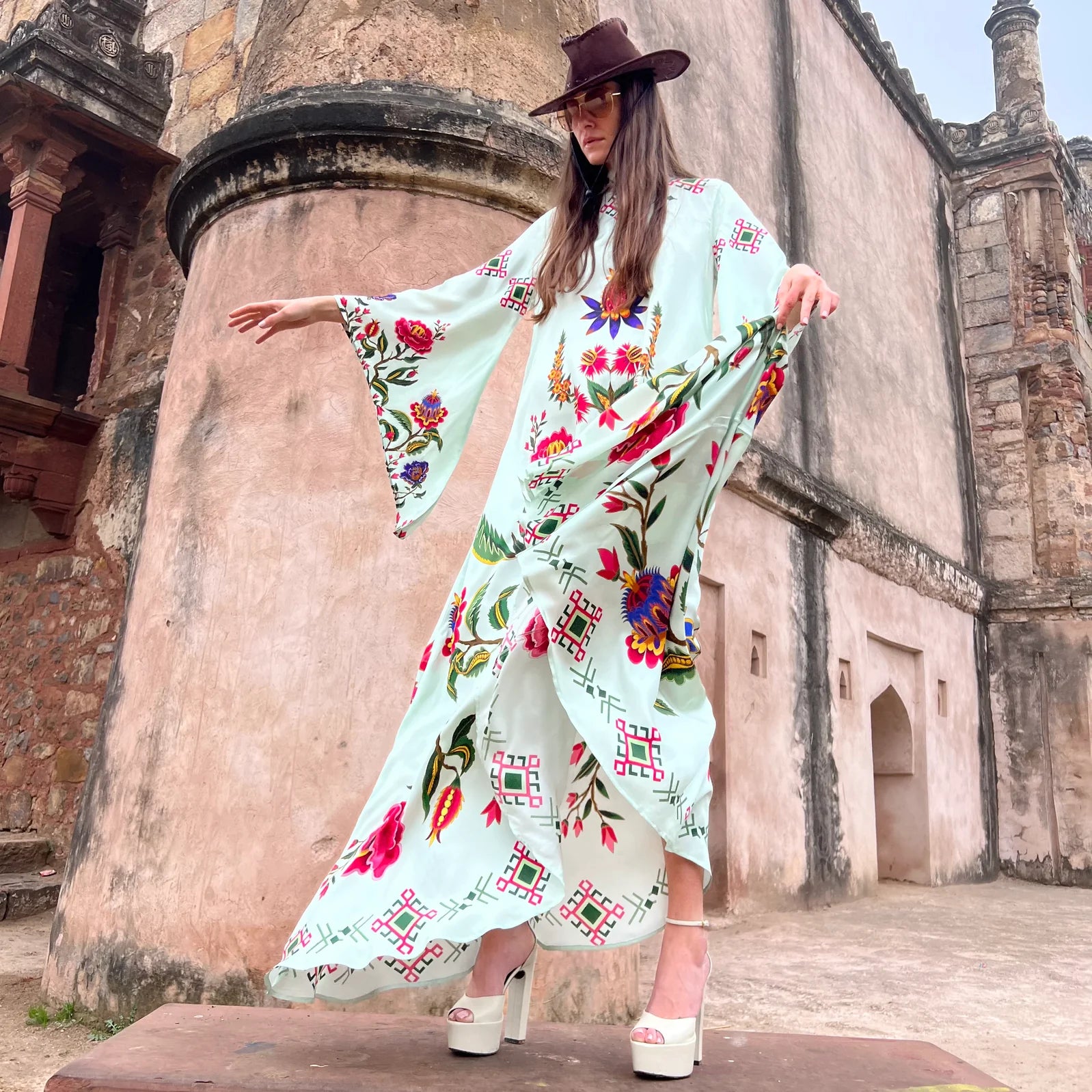 The "Ethno Floral Princess Dress" features an enchanting ethno-floral pattern, vibrant colors, and intricate details for a radiant and elegant look. The flowing silhouette accentuates your curves with grace and lightness, while the pure silk fabric adds a luxurious touch. Crafted with meticulous attention to detail, this Simone Bruns dress exudes exquisite craftsmanship and sophistication, making it a timeless classic.