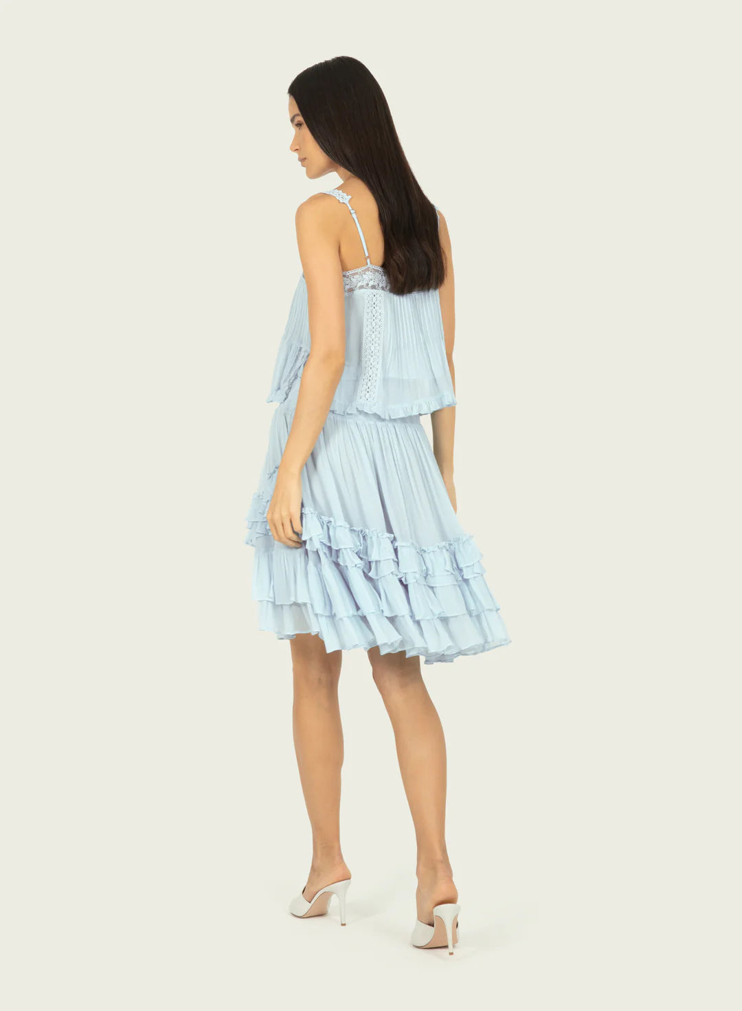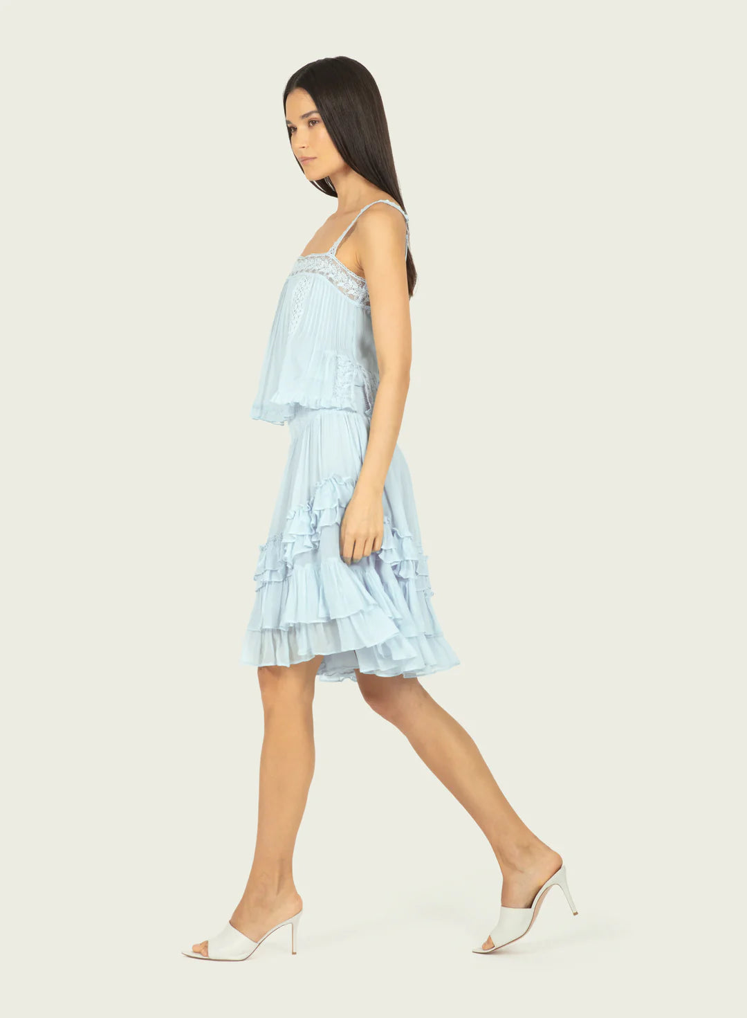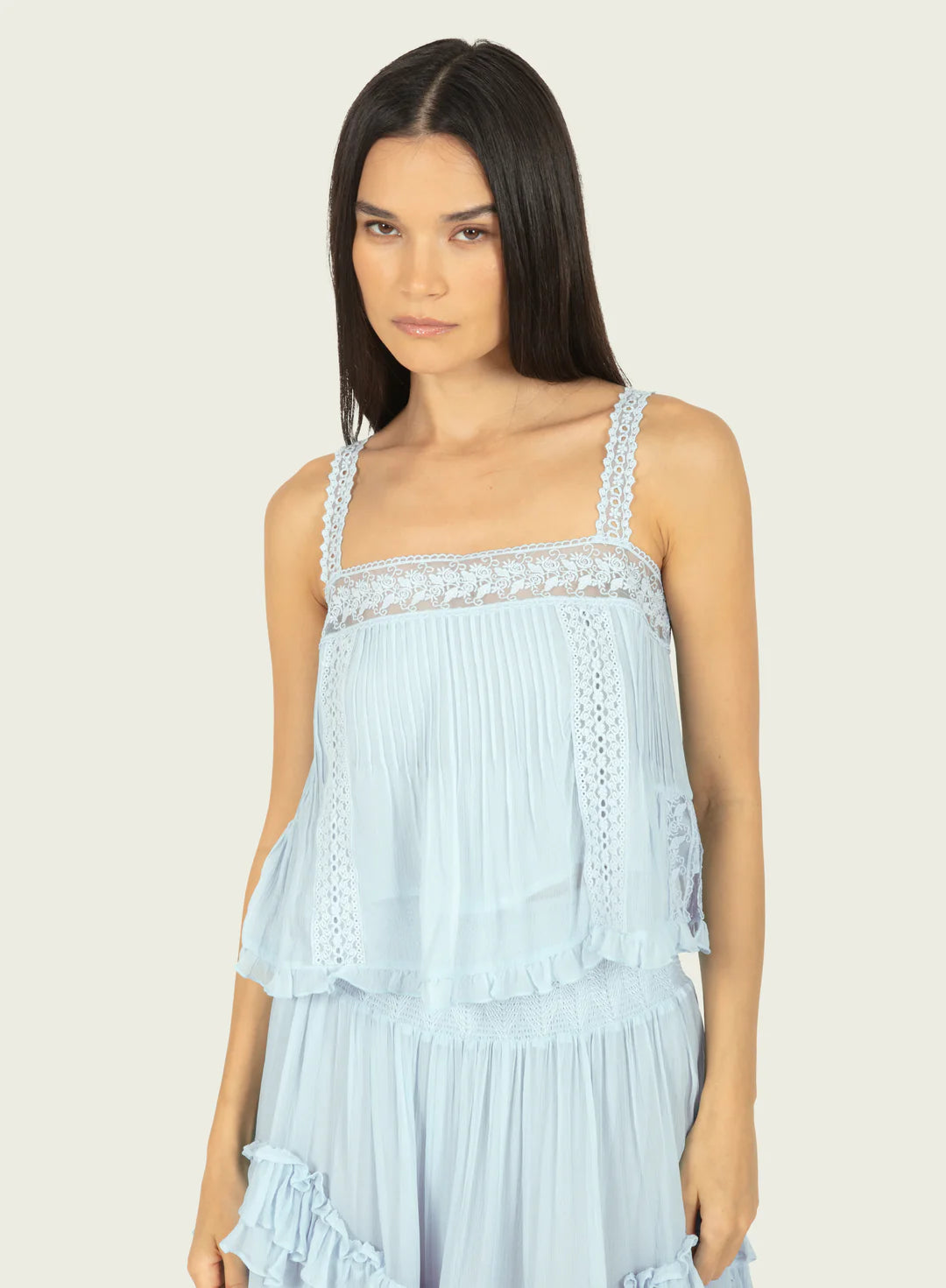 Inspired by vintage, this elevated tank top provides elegance with a sense of ease. This slip on design is made from silk crinkle chiffon with floral lace inserts. Easily styled with our matching Nilou Skirt or a simple jeans.
